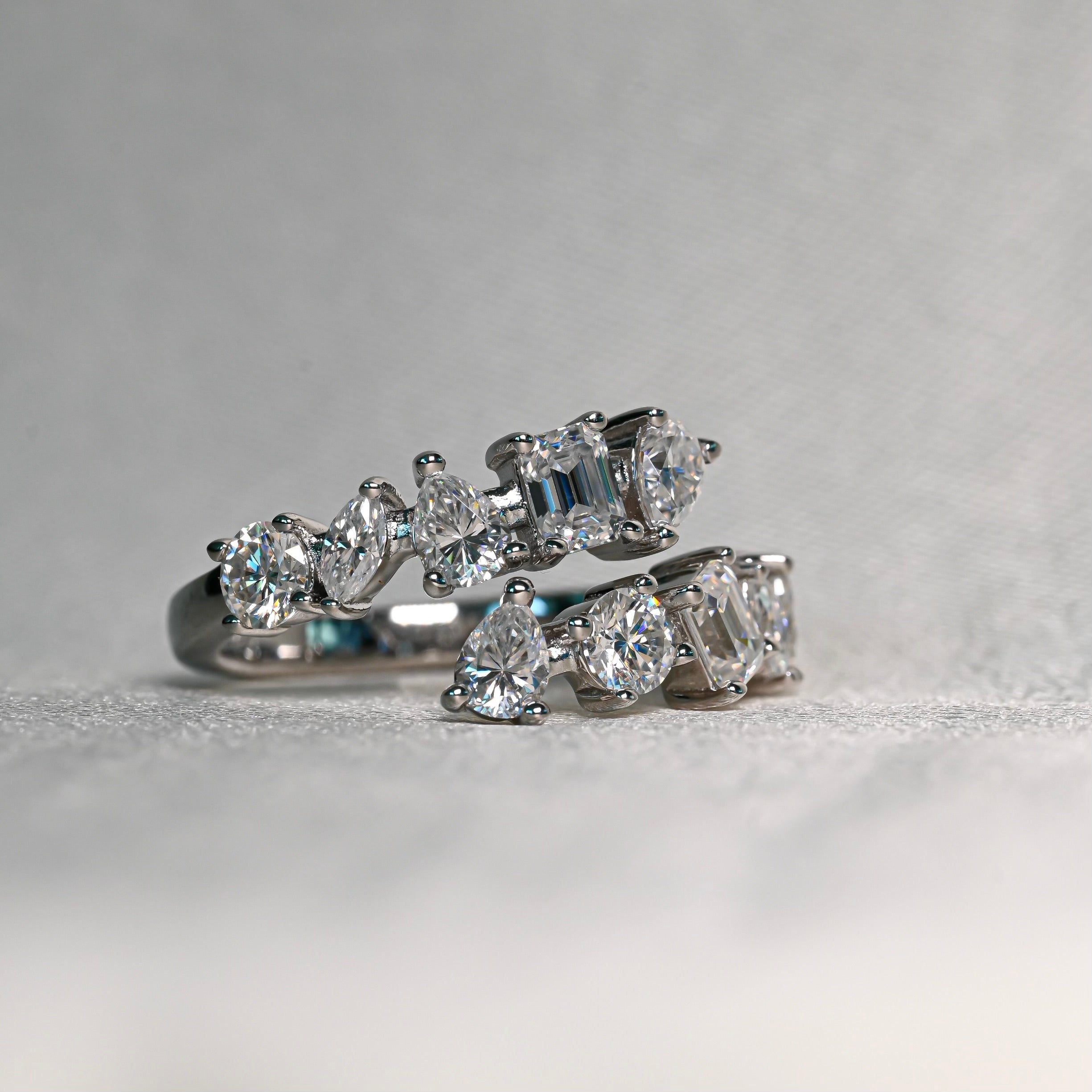 Crafted in premium 925 sterling silver, this elegant open band showcases a striking composition of brilliant Moissanite stones in a refined mix of emerald, pear, and marquise cuts. The alternating silhouettes create a modern yet timeless design, offering exceptional sparkle and visual balance from every angle.