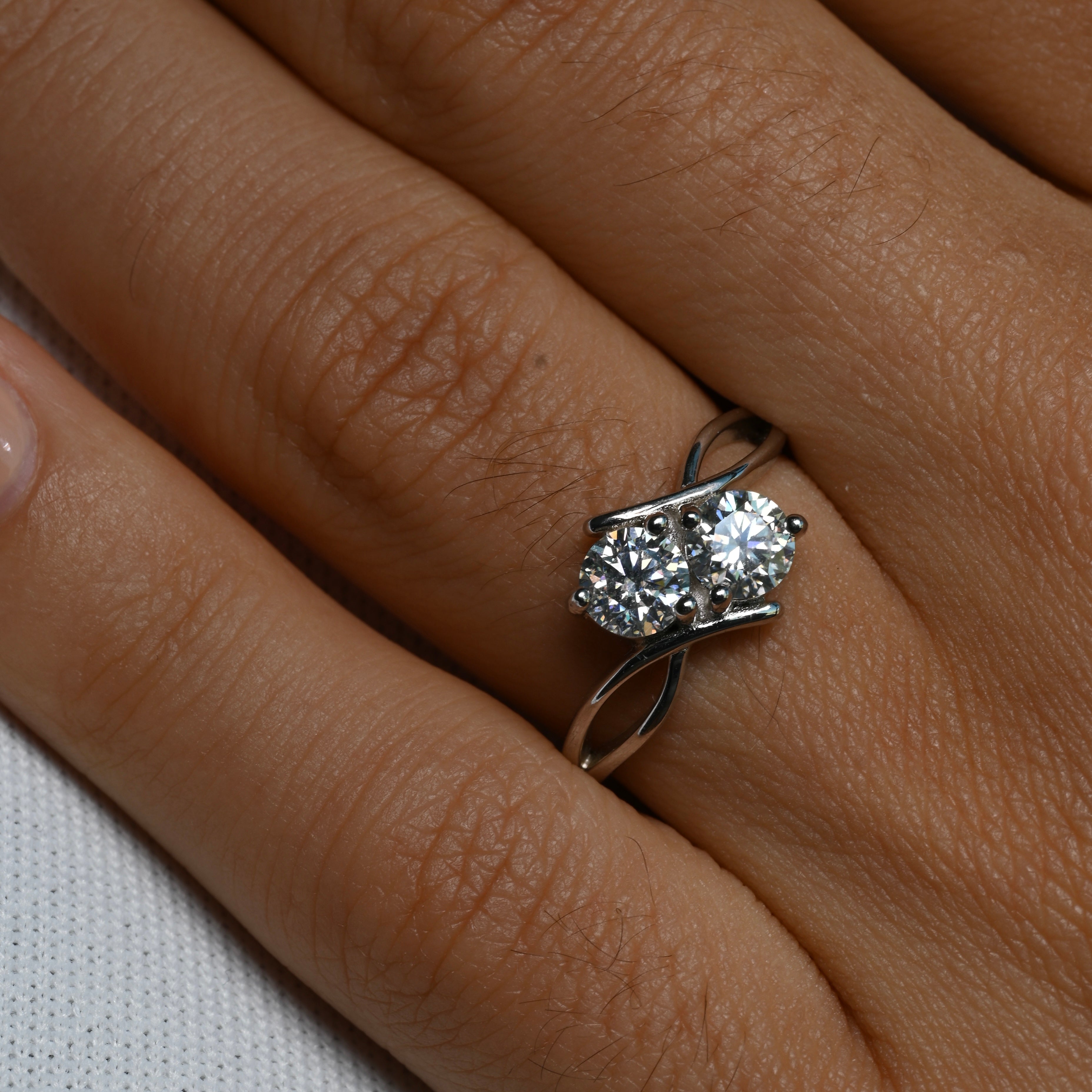 Introducing our exquisite AURORA Moissanite 0.5 carat ring in white gold plating, a dazzling expression of love and elegance. Crafted with meticulous attention to detail, this ring boasts captivating two-stone moissanites, radiating brilliance and charm.