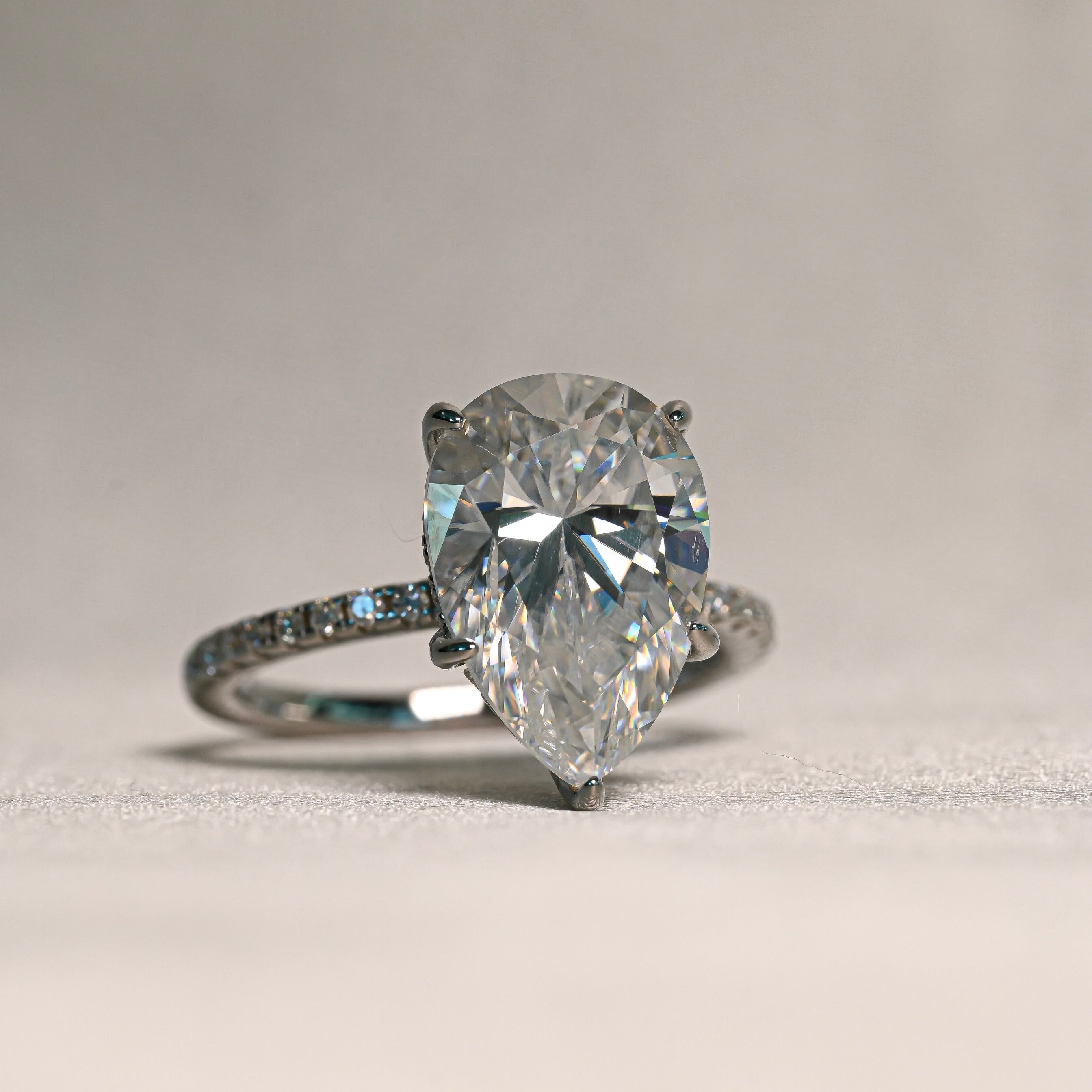 The BERNADETTE Ring features a breathtaking 5-carat pear-shaped Moissanite, set in genuine 925 sterling silver with rhodium plating for a refined, mirror-like finish. The slender band, adorned with pavé zirconia stones, enhances the brilliance of the center stone—creating an irresistible sparkle from every angle.