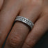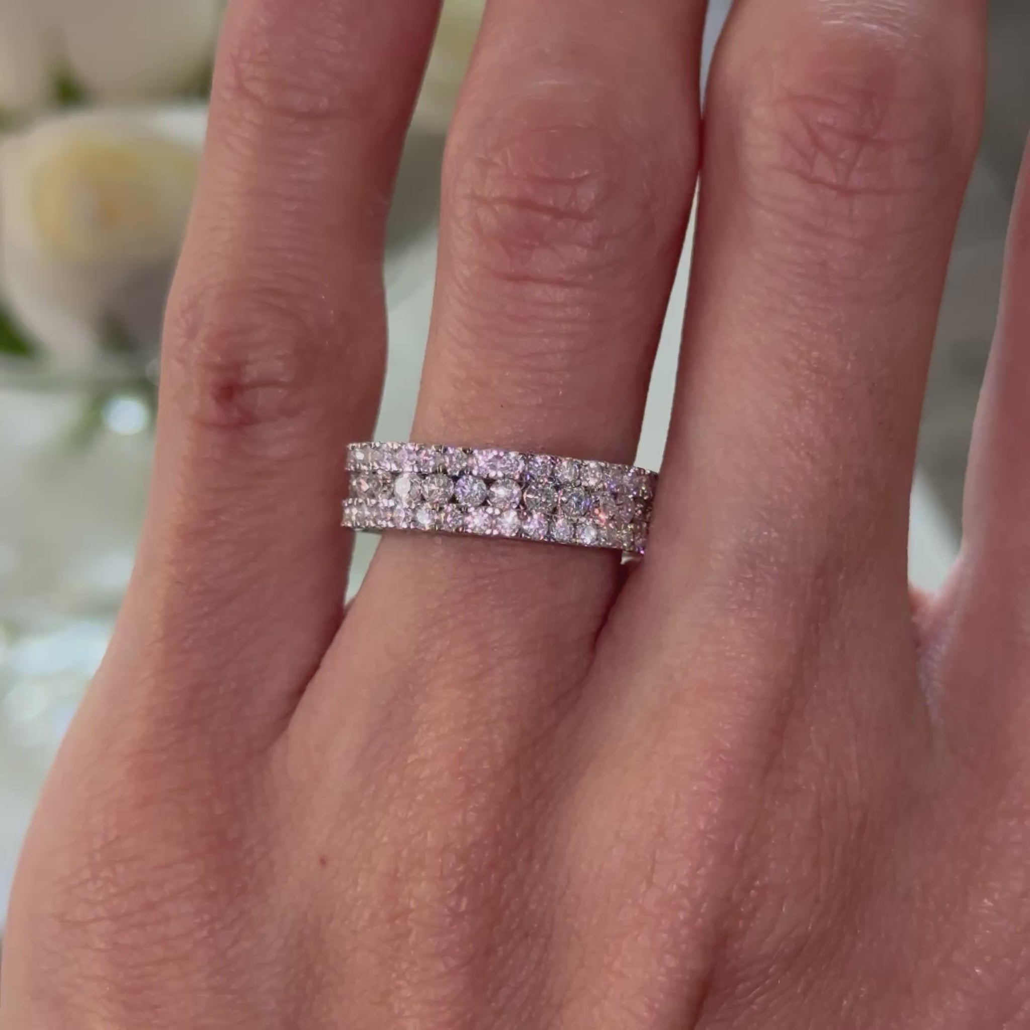Crafted from premium S925 sterling silver, the dazzling CIDRA Moissanite eternity band showcases a harmonious blend of brilliance and sophistication. Featuring a total of 97 sparkling moissanites (21 stones at 3mm and 76 stones at 1.5mm), the ring boasts a total carat weight of 3.24ct. The luxurious 6.5mm width and intricate pavé setting highlight the fiery brilliance of the moissanite stones, making it a stunning choice for weddings, anniversaries, or simply elevating everyday style. Lightweight yet durable at approximately 5.8 grams, this piece exudes timeless elegance.