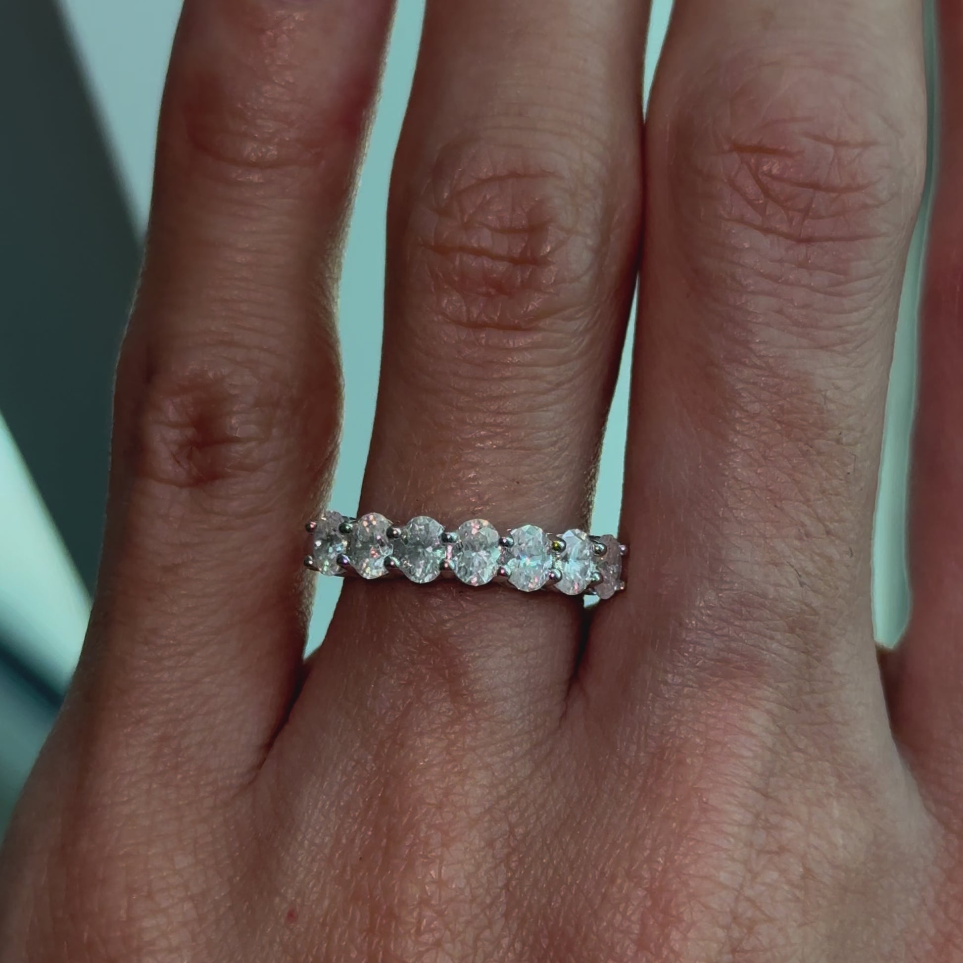Crafted in premium 925 sterling silver with rhodium plating, the FAHDA Moissanite Band features a striking arrangement of seven oval-cut Moissanite stones, thoughtfully set to create a refined and contemporary silhouette. Each stone measures approximately 5 × 3.5 mm and weighs around 0.43 carat, forming a harmonious total of 3.00 carats of radiant brilliance.