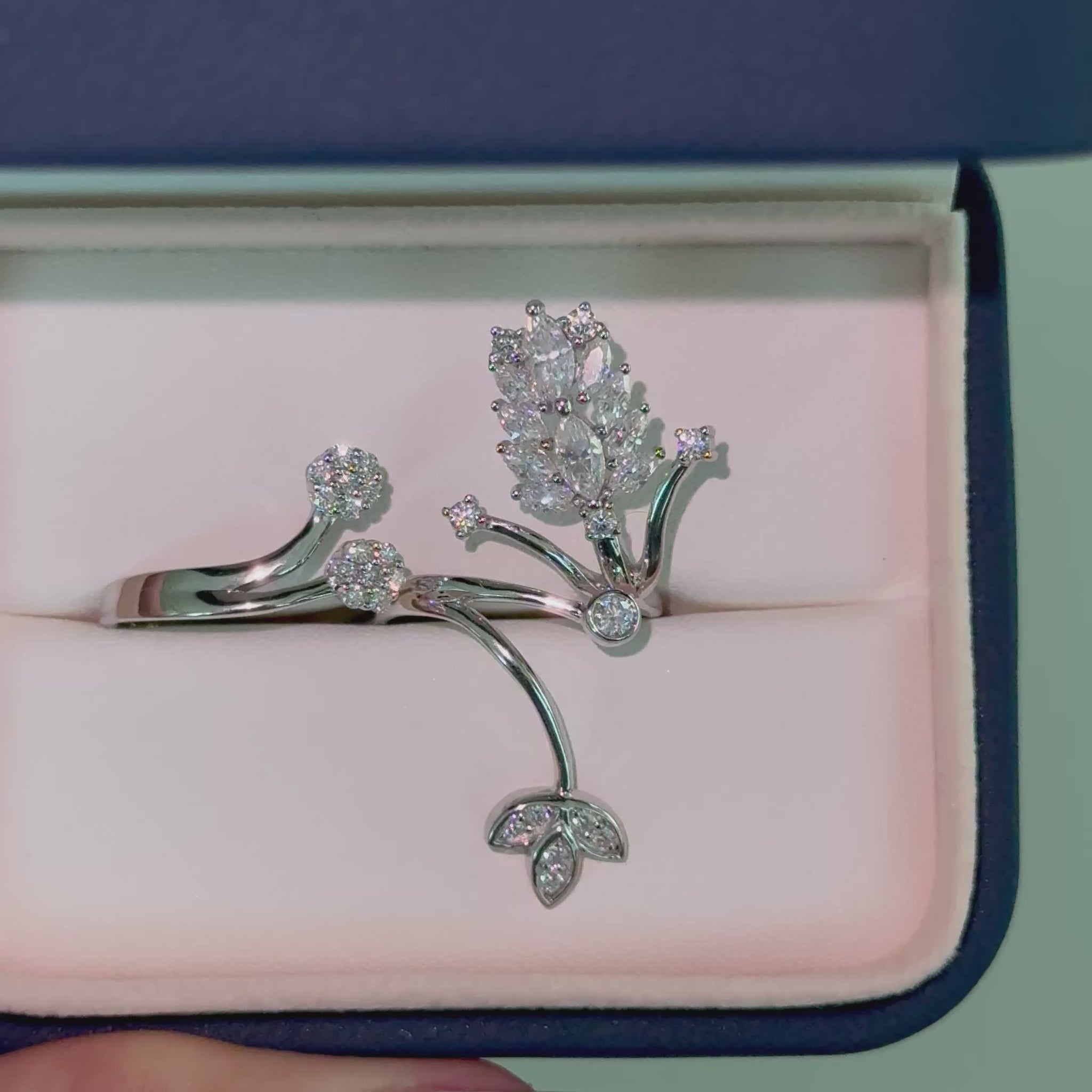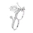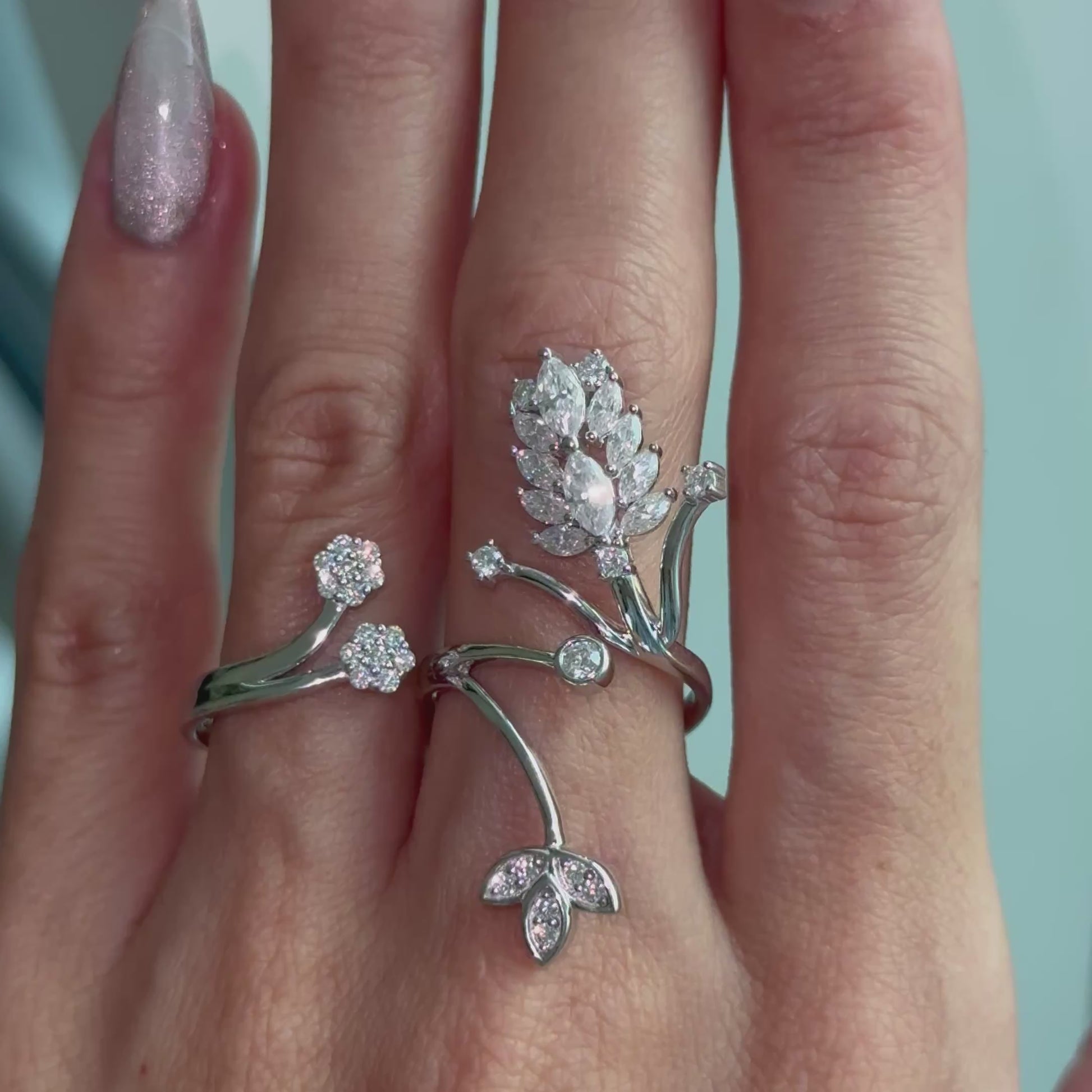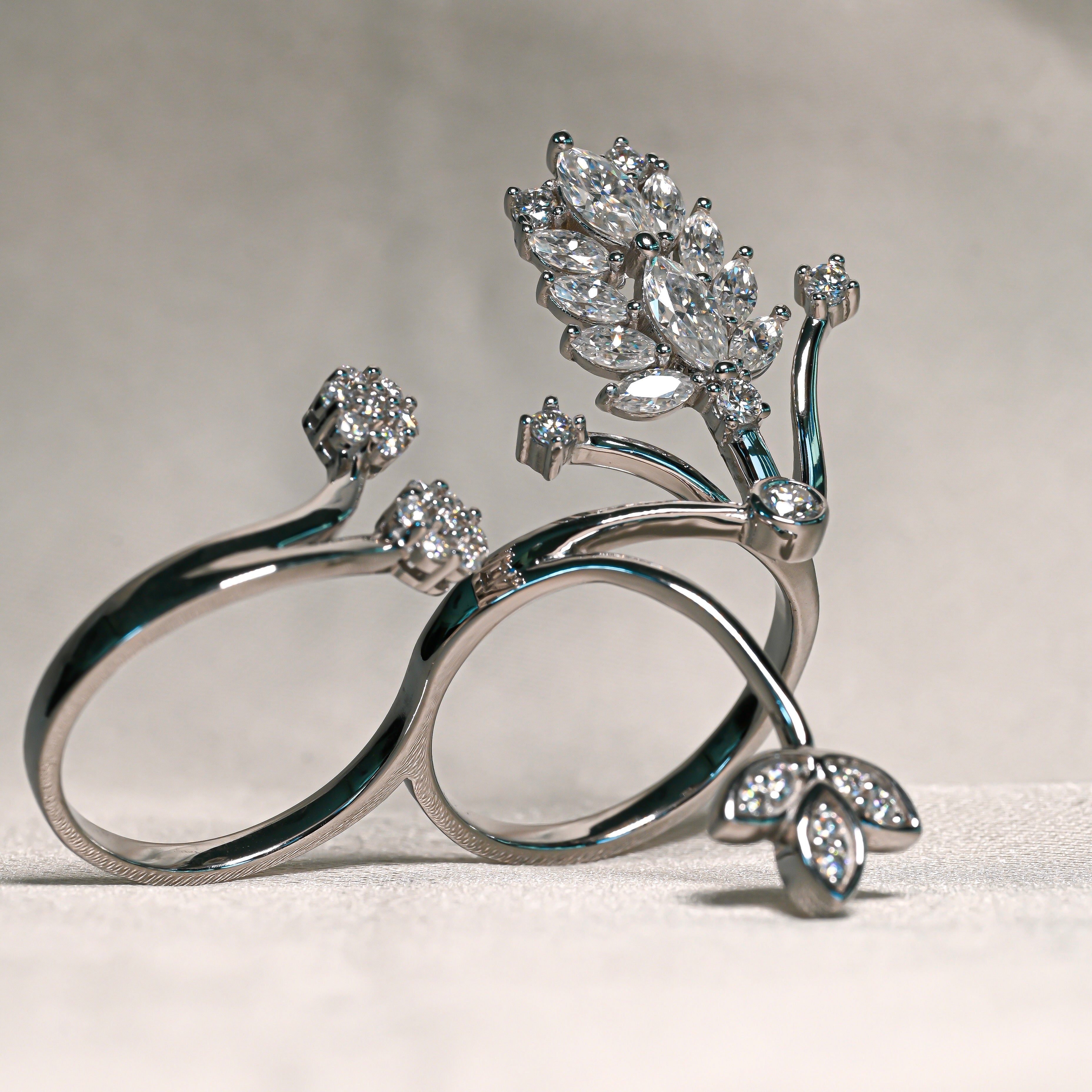 A statement of artistry and sparkle, the Floral Double Moissanite Ring is crafted in sterling silver with sleek rhodium plating. Designed as a double-band ring, it blooms with marquise-cut Moissanite stones, pavé clusters, and a delicate bow detail, creating a graceful floral silhouette. Perfect for special occasions, this ring is a bold yet elegant piece that makes every gesture unforgettable.