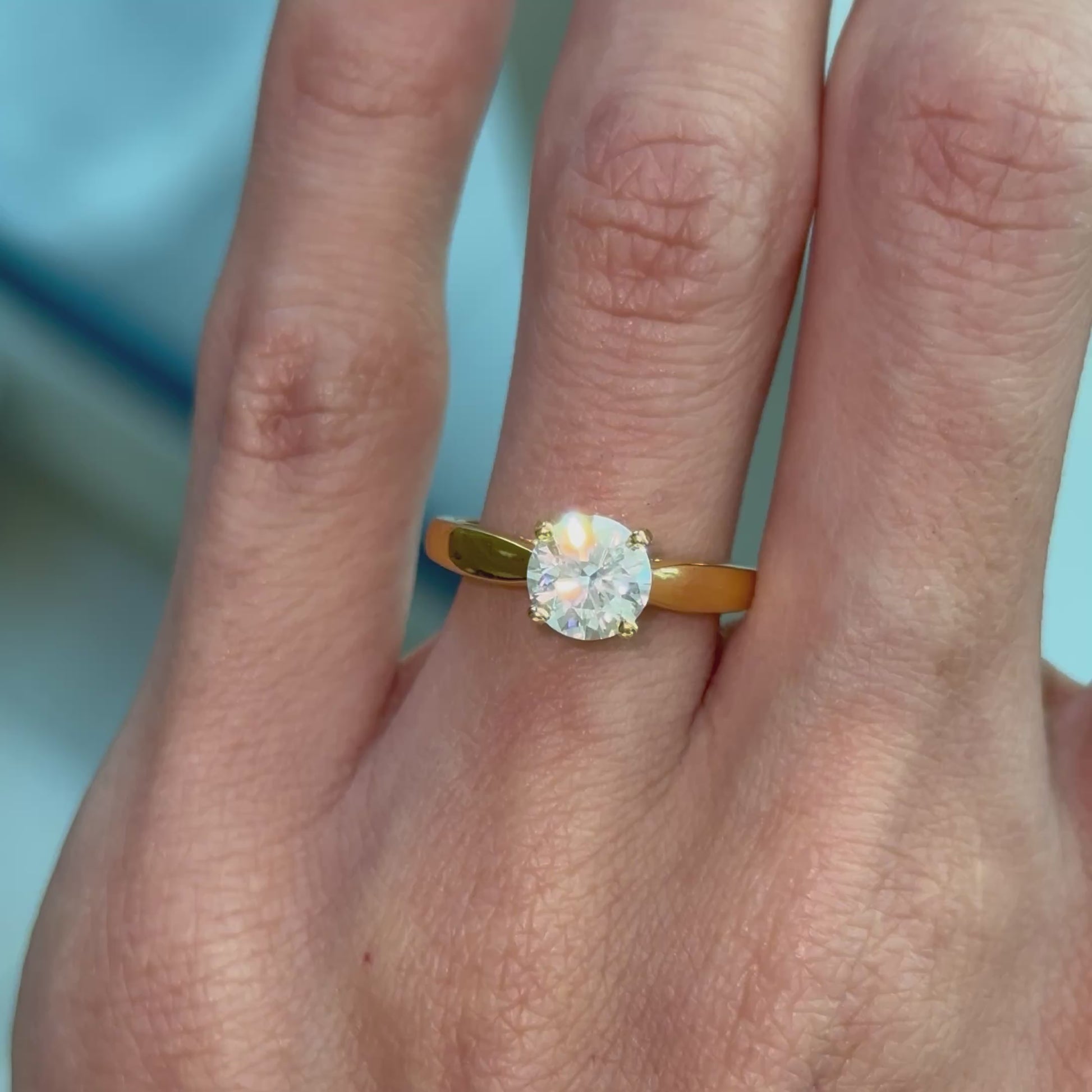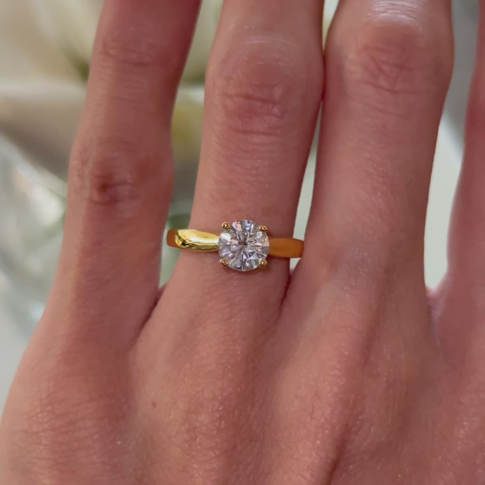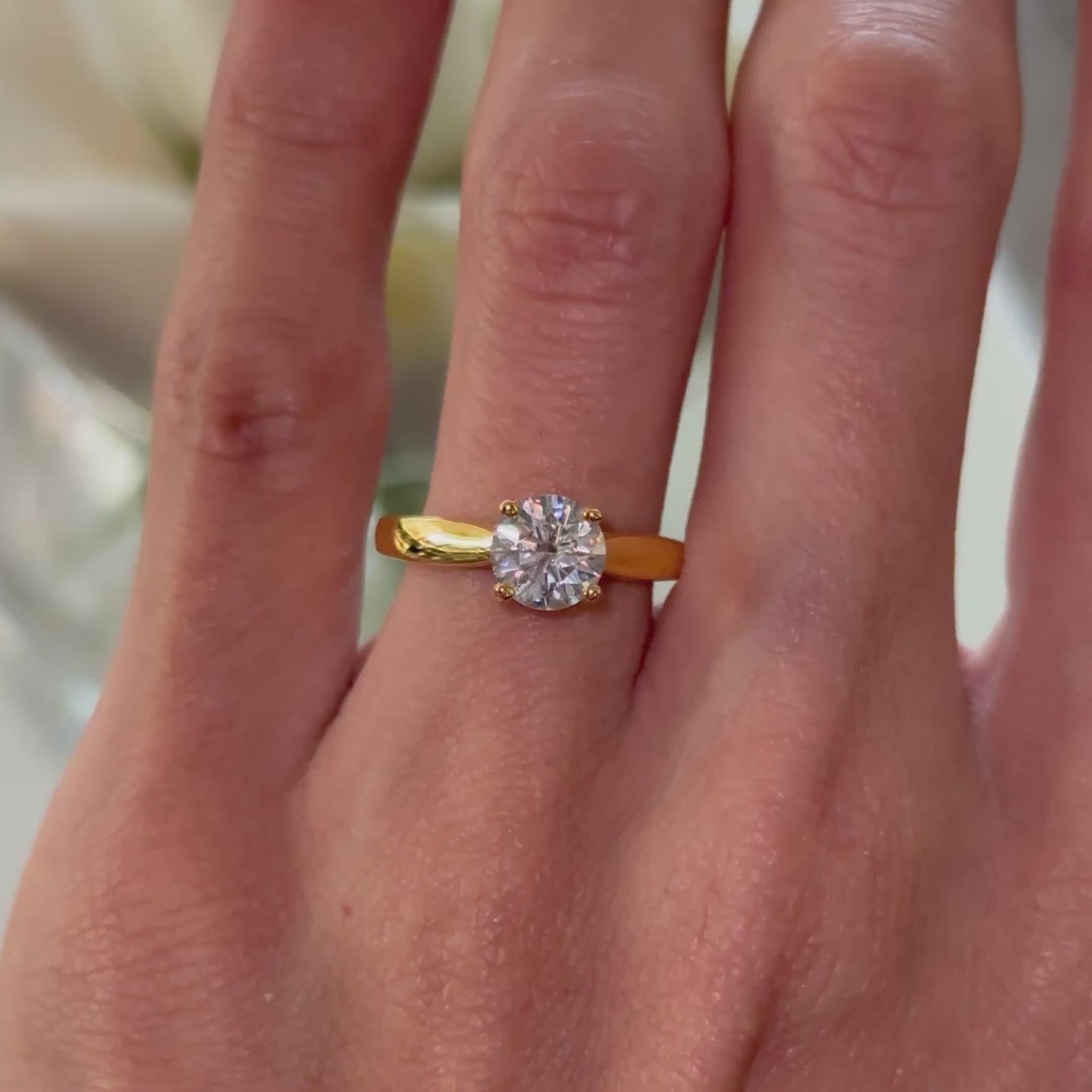 A classic symbol of love and sophistication, this solitaire ring features a dazzling 1-carat Moissanite, set in genuine 18K yellow gold plating. Designed for brilliance, its sleek band enhances the radiant sparkle of the stone, making it a perfect choice for engagements, anniversaries, or an elegant everyday statement.