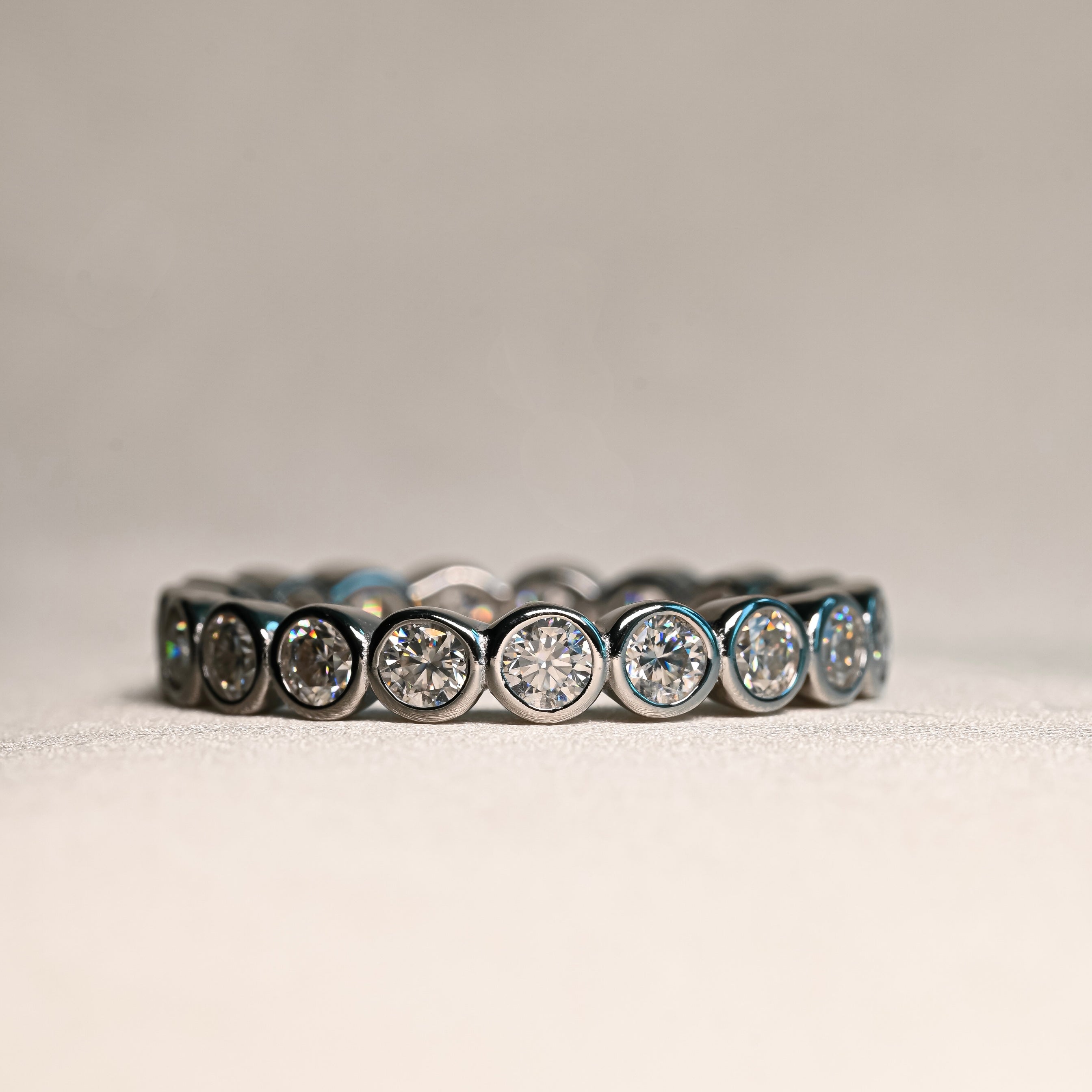 Introducing the LEENA Moissanite Eternity Band: a sterling silver ring adorned with 3mm, 0.1-carat moissanite stones. This timeless design radiates elegance and charm, making it perfect for adding sparkle to any outfit.