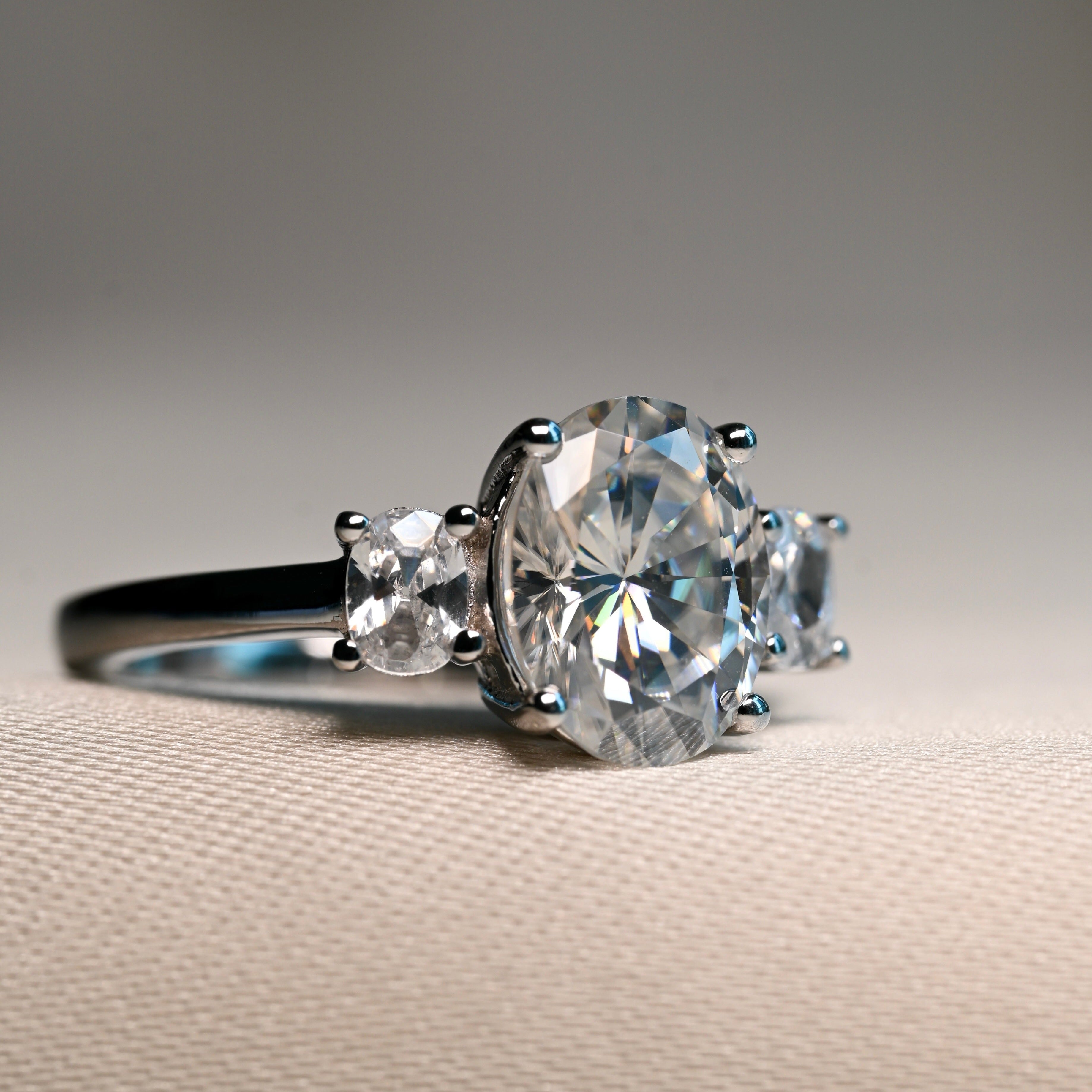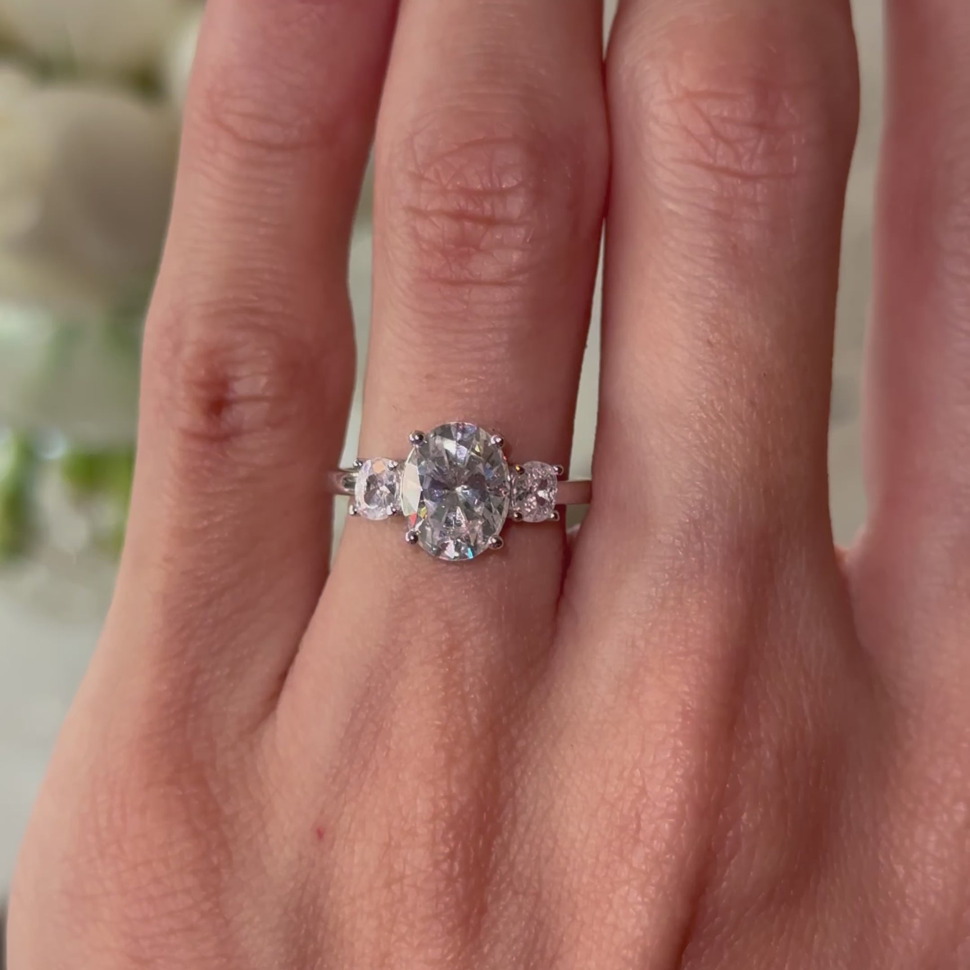 Elevate your style with our exquisite NAOMI Moissanite Ring 2ct. Featuring a stunning large oval moissanite centerpiece flanked by two brilliant zirconia stones, this ring is designed to exude class and make a striking impact. The spectacular three-stone design is complemented by a delicate 1.6mm solitaire band, resulting in an alluring and timeless piece.