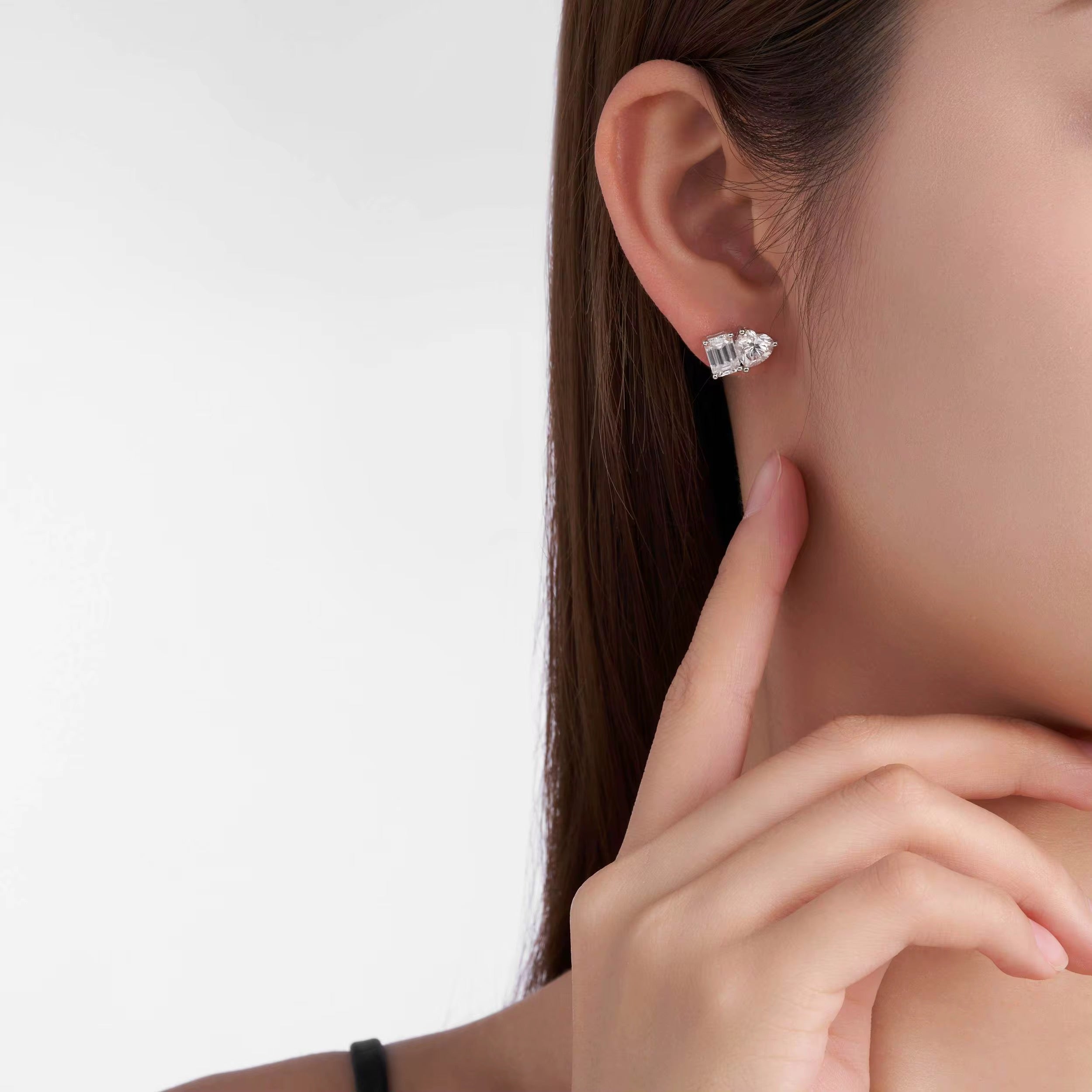 Each earring is set with two Moissanite stones — an emerald-cut stone paired with a heart-shaped stone — each 1ct Moissanite, carefully cut to maximize brilliance and fire.