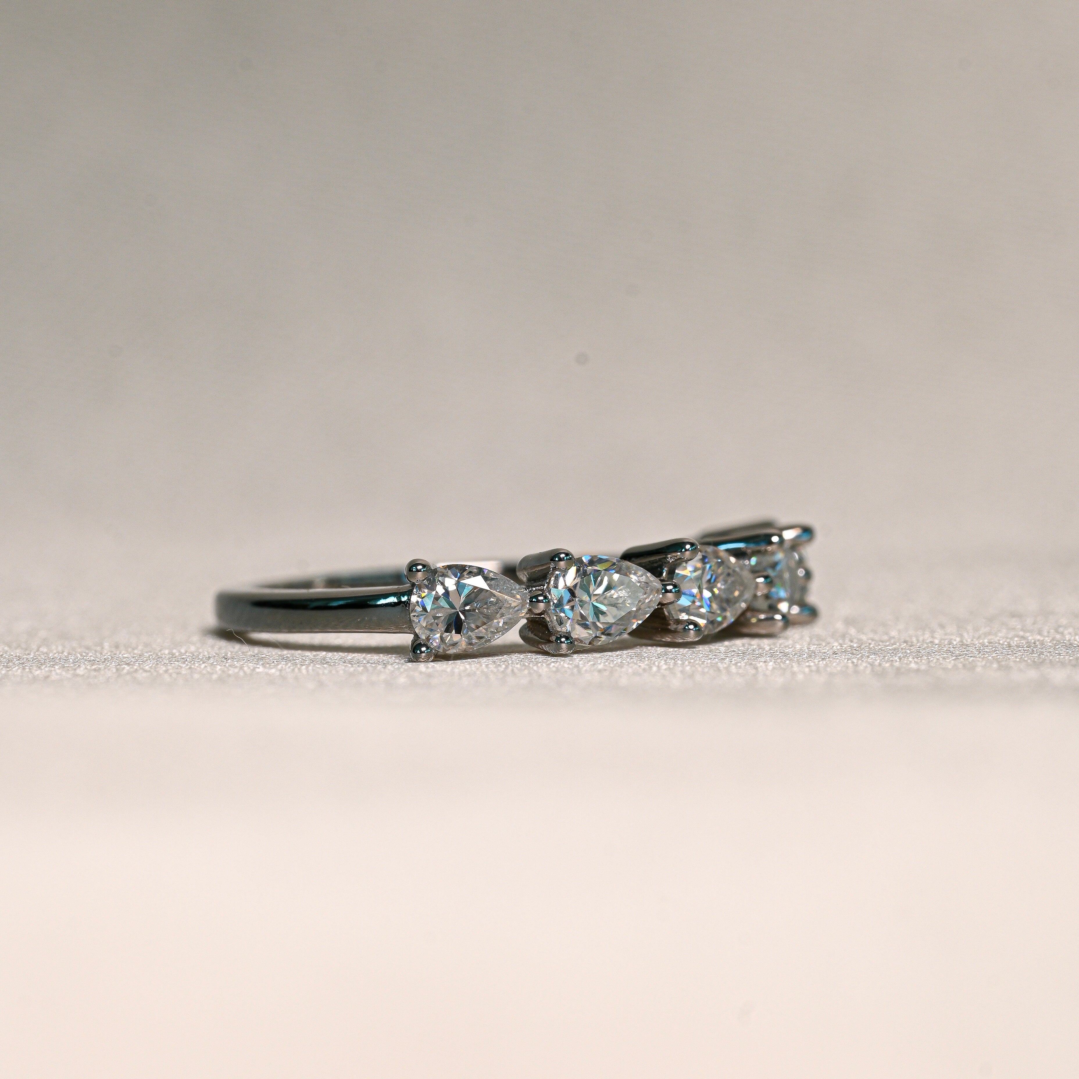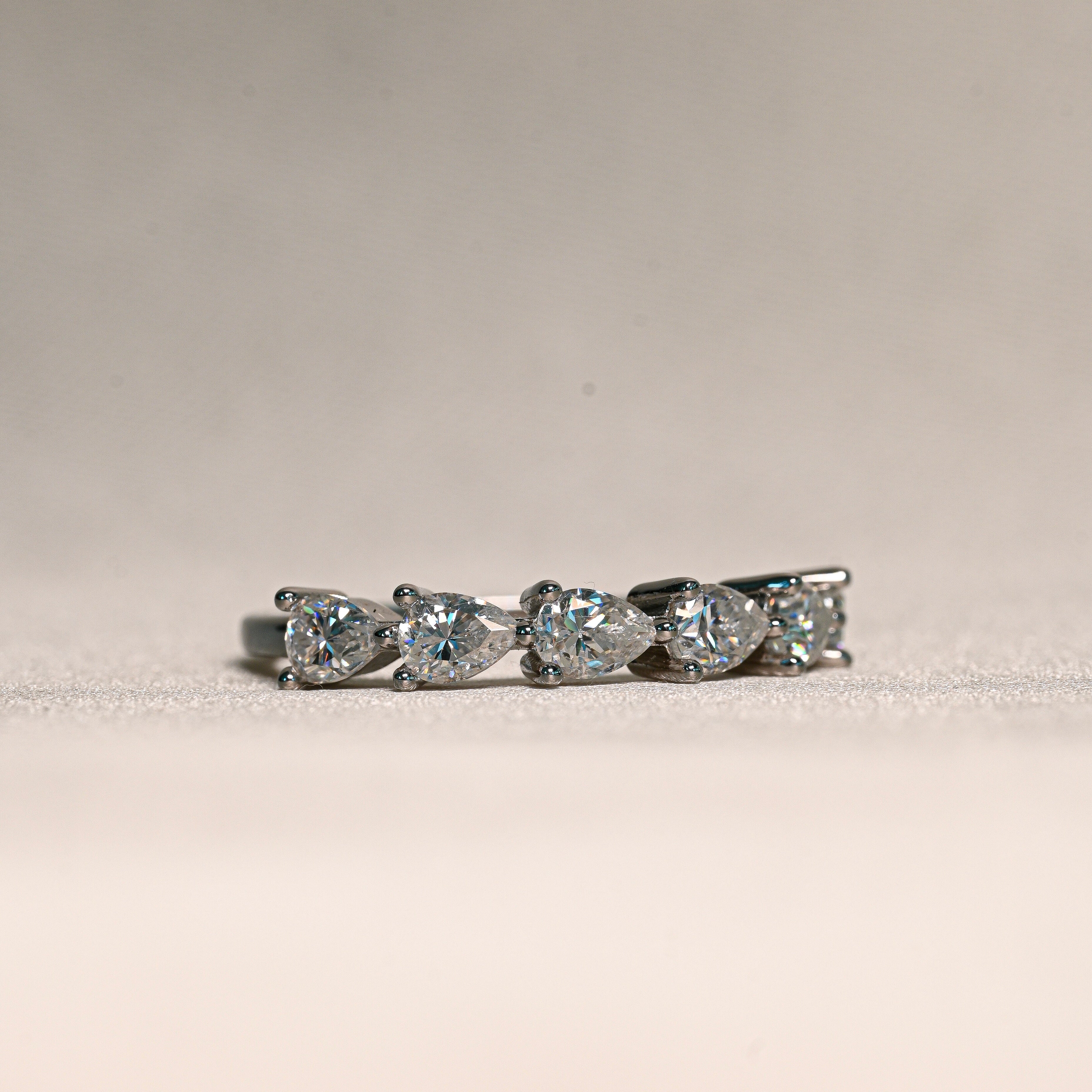 The Valentina Band features a graceful row of pear-shaped Moissanite stones, each radiating exceptional brilliance. Expertly crafted in 925 sterling silver with rhodium plating, this elegant band shines beautifully on its own or paired seamlessly with an engagement ring.